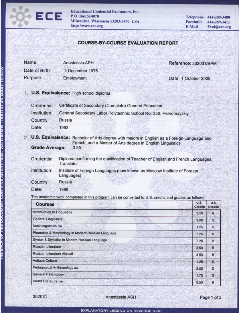 My University Diploma evaluated by Educational Credential Evaluators (ECE) - p 1